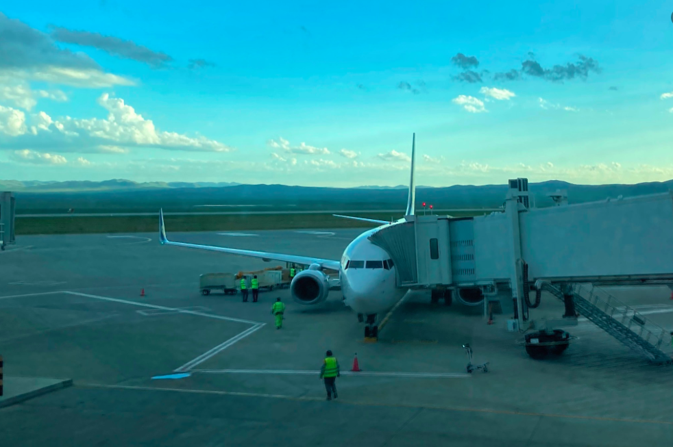 Ulaanbaatar International airport is surrounded by pasture land and mountains in the distance.